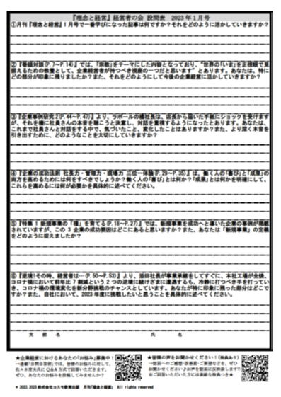 毎月1回『理念と経営』をテキストに、地元の経営者と経営について学ぶ会です。 設問表に沿って行なうので、テーマを絞って学ぶことができます。